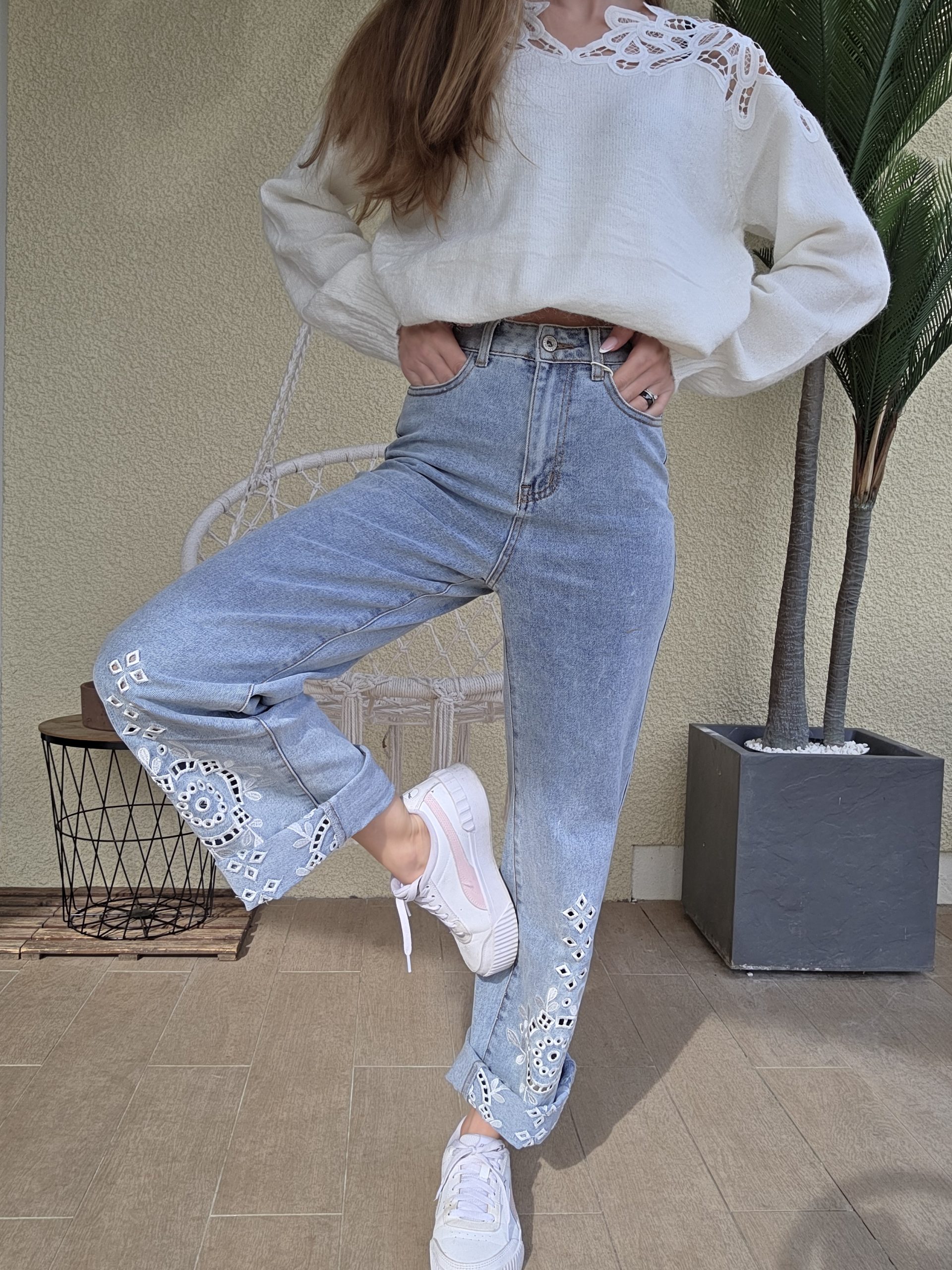 On adore ses broderies délicates au bas des jambes qui apportent une touche bohème chic et féminine. Ce détail raffiné sublime le denim et donne à ce jean un caractère unique, parfait pour celles qui aiment les pièces fortes mais faciles à porter.